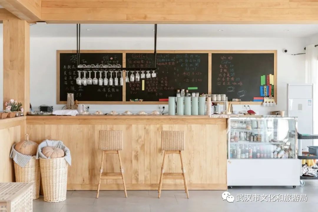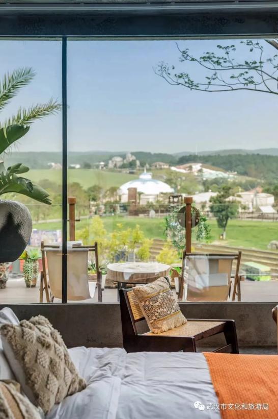 纯白木屋「云稼慢乡原宿」,共16间客房可入住,最特别的一间是两室一厅的沙滩房,每个房间都有落地玻璃,拉开窗帘,对面就是波光粼粼的梁子湖。