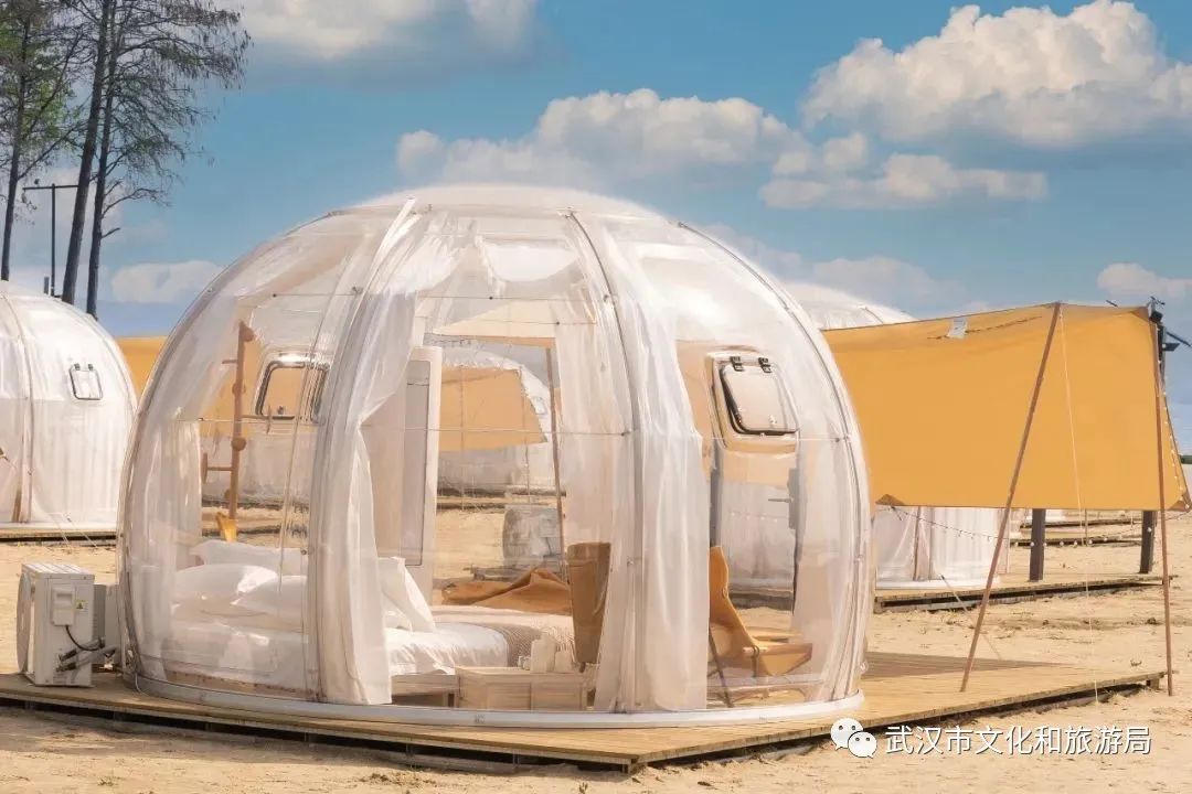 迈入初夏,东湖沙滩如期开放,武汉人的快乐回来了。沙滩的露营区,最吸睛的就是「透明星空屋」和一排排「韩式帐篷」。