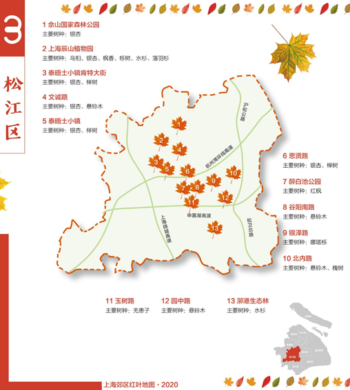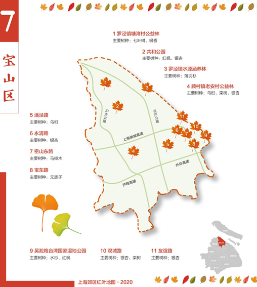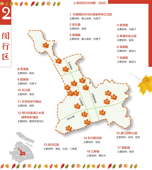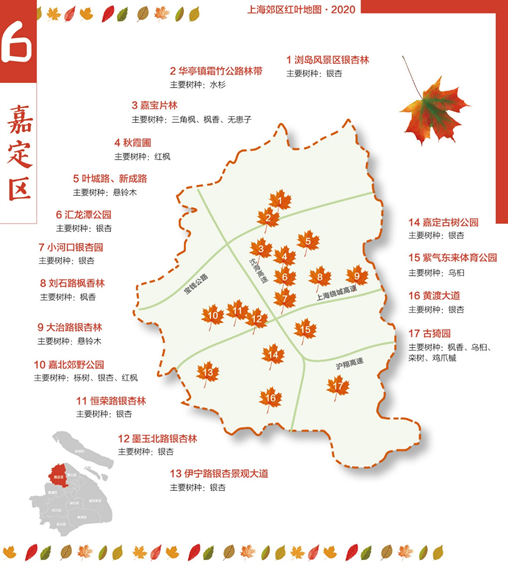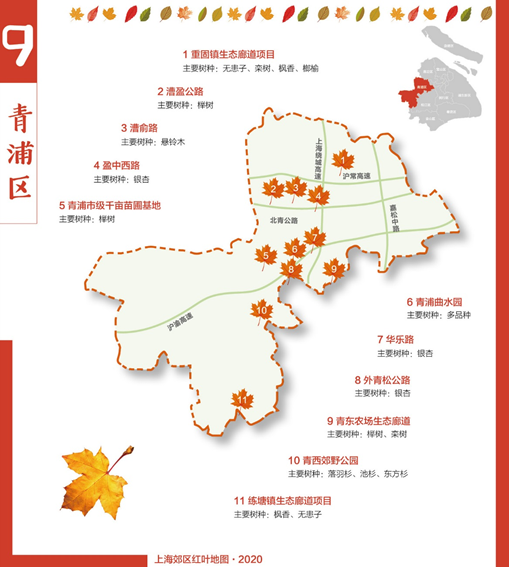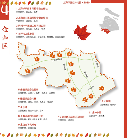 澎湃新闻记者发现,2020年的上海郊区红叶地图聚焦浦东新区、闵行、嘉定等9个区,标注了银杏、乌桕、栾树、悬铃木、无患子、娜塔栎等上海主要色叶树集中分布的路段、公园、片林和苗木基地。