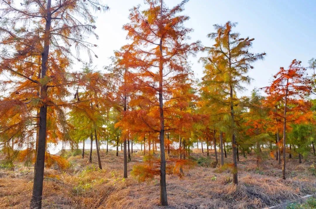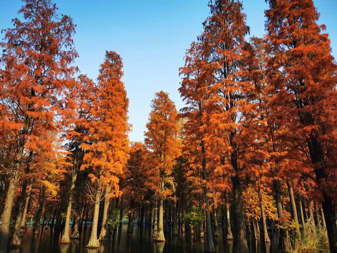要说青西郊野公园,就不得不提它的水上森林,已经由绿转红的杉树林倒影水中,吸引不少游客驻足拍照。