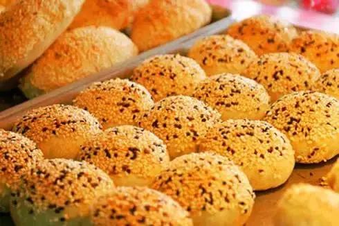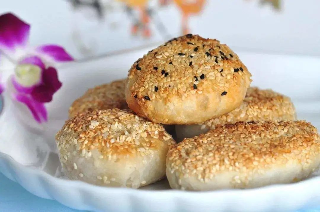 外沾一层芝麻,贴在烘炉壁上烘烤而成。