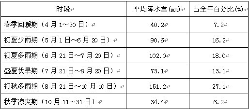 初夏少雨期(5月1日~6月20日):相对湿度6月上中旬的54%,达到全年最低值。