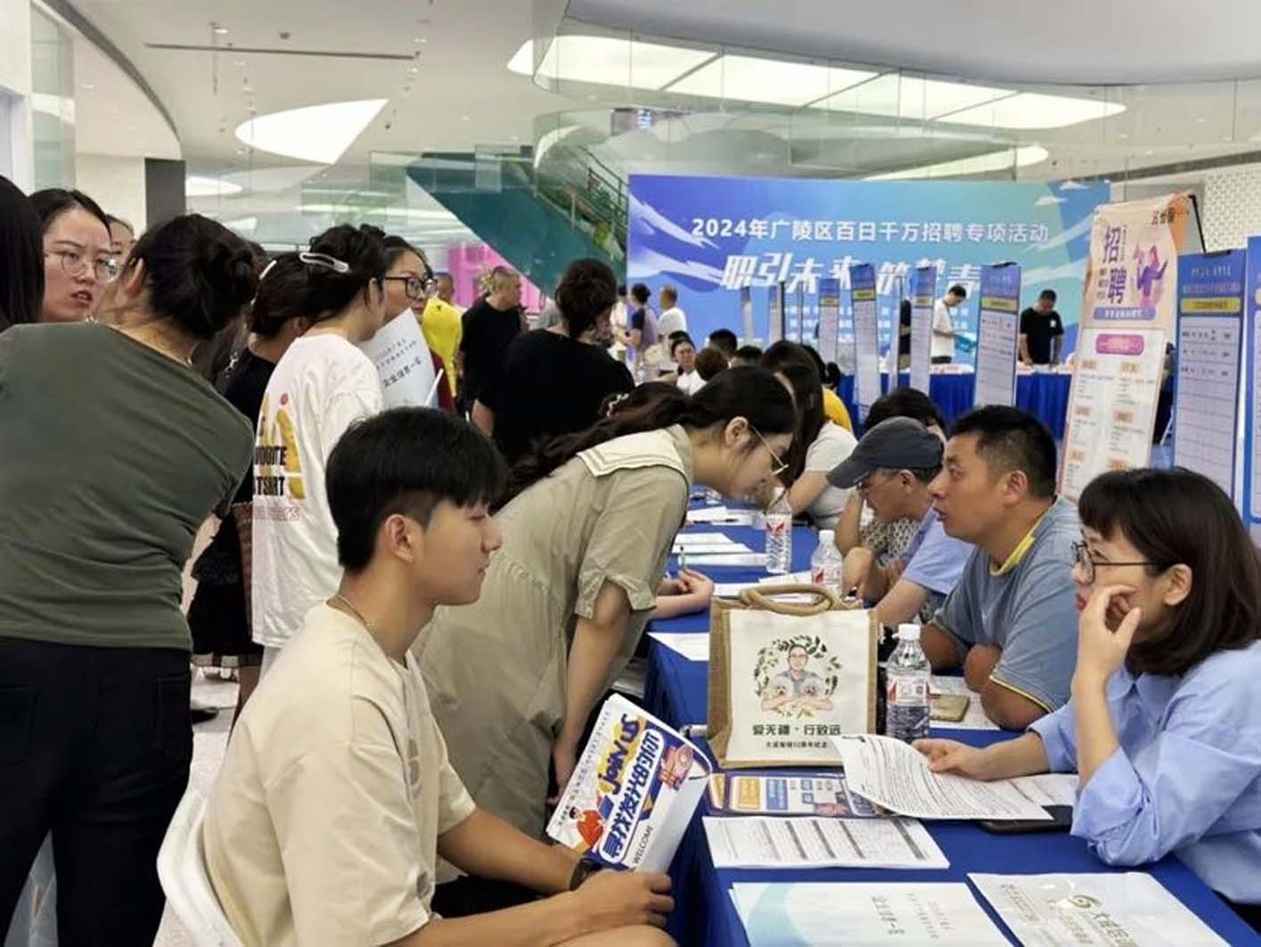 据了解,本次活动以“职引未来 筑梦青春”为主题,邀请了44家企业参与,提供了719个工作岗位,涵盖多种行业,可以满足各类人员的求职需求。活动在SM扬州城市广场举办,吸引了不少求职者热情参与,现场咨询的人络绎不绝。相较于传统招聘会,在商场举办招聘活动拉近了用人单位和求职者之间的距离,交流环境更轻松,沟通效率更高。“近期天气还是比较炎热,能在凉爽的商圈招聘非常人性化。”现场企业负责人表示。