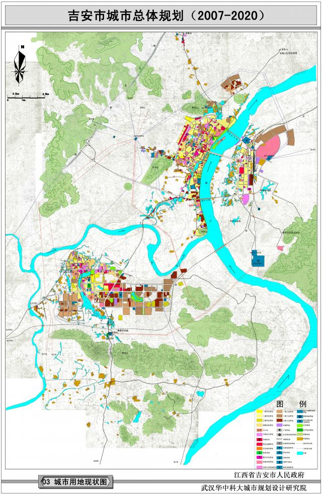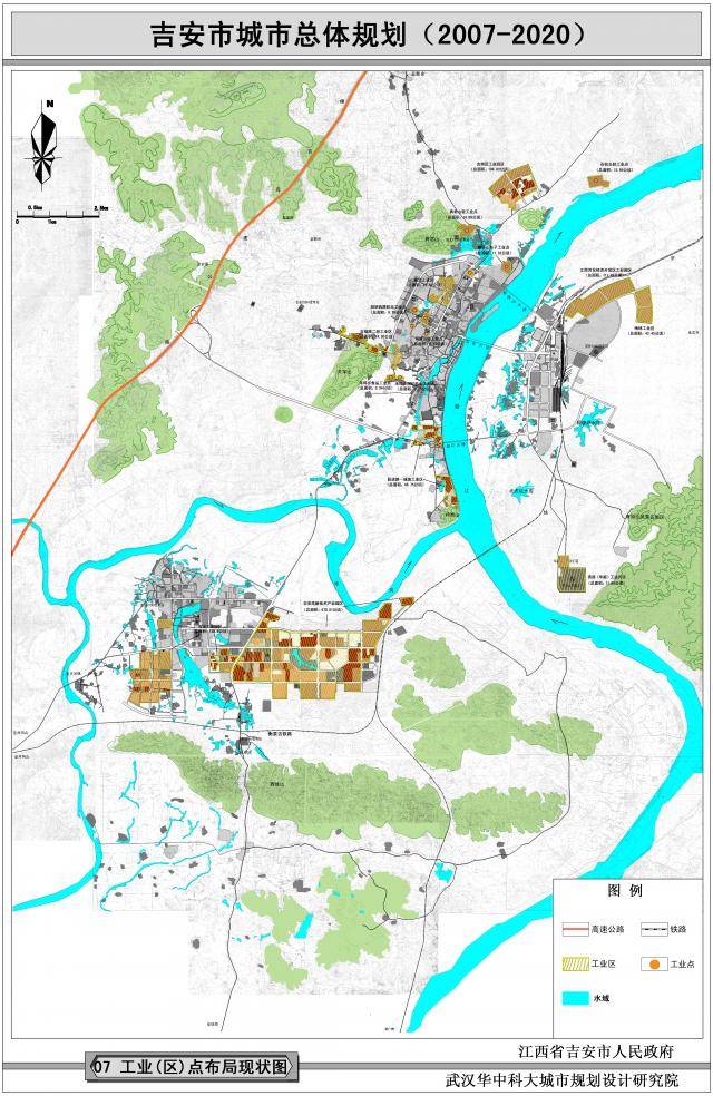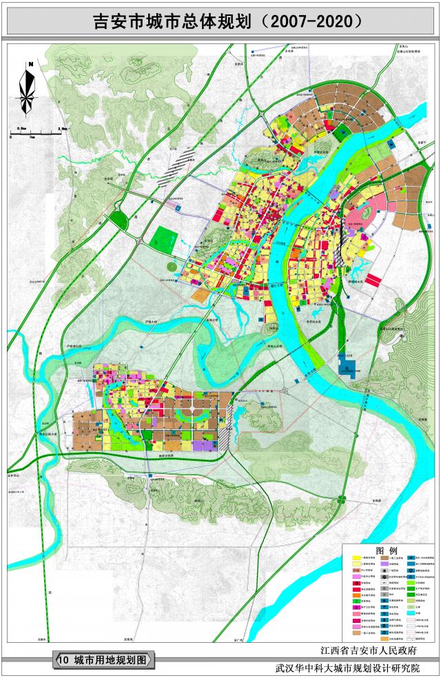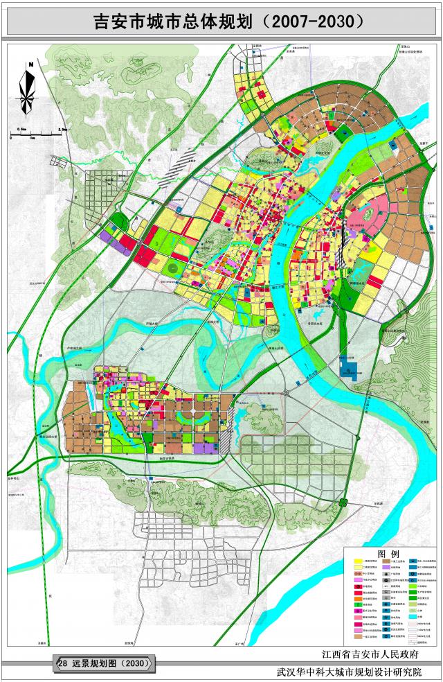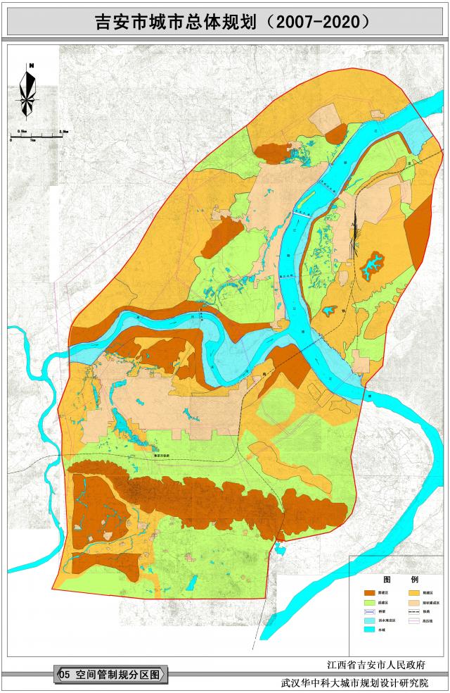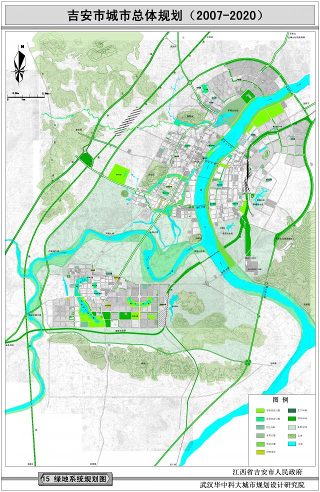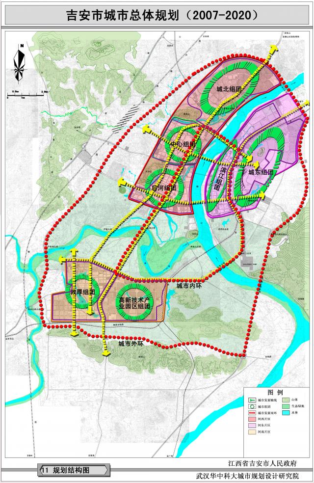 以空间布局规划为纽带,实施城镇化战略意图,增强城镇化与工业化的互动机制。以产业空间布局为基础组织城镇空间结构,以城镇空间规划引导经济要素的合理配置和经济运行环境的全面改善。构筑“三心”(中心城区、泰和、井冈山)和“一带”(京九沿线城镇发展带)点轴聚合发展总体空间格局,整体形成“一核带双极、主轴贯南北、次轴振两翼”的“蝶形”城镇主体架构。