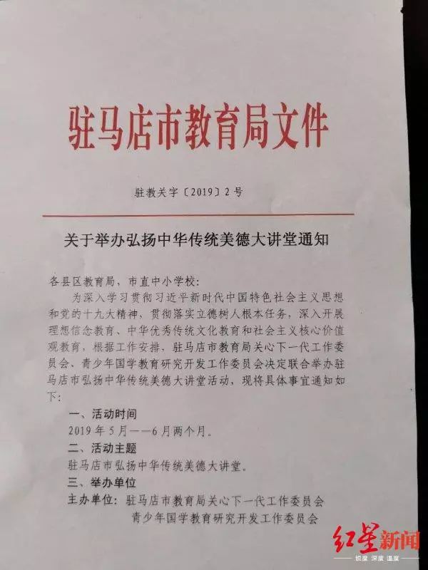 红星新闻获取的相关材料显示,该“弘扬中华传统美德大讲堂”活动,系驻马店市教育局相关部门主办的活动,由相关部门向各县区教育局、市直中小学校下发红头文件,要求各县区教育局、市直中小学校、幼儿园“充分认识到开展弘扬中华传统美德联系的重要性,重视并做好活动的组织工作,本次活动为公益性大讲堂,不收取任何费用”。