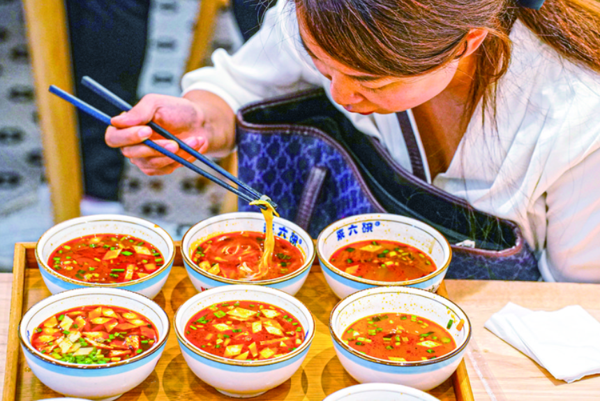 顾客在一家岐山臊子面餐馆内品尝臊子面。新华社记者 邵瑞 摄