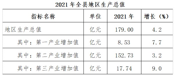 经初步核算,全县实现地区生产总值(GDP)179.00亿元,同比增长4.2%。其中,实现第一产业增加值8.53亿元,增长7.7%;实现第二产业增加值152.73亿元,增长3.2%;实现第三产业增加值17.74亿元,增长9.0%。