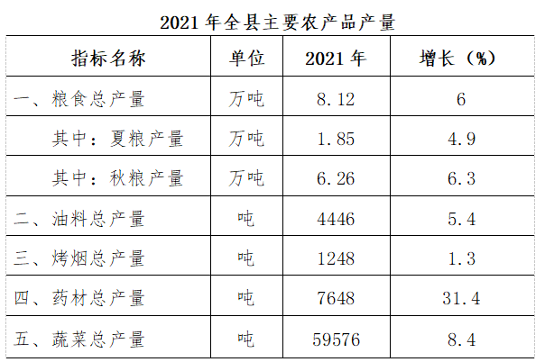 完成种植业总产值6.96亿元,同比下降5.1%。全年粮食作物播种面积22916公顷,增长5.3%,粮食总产量达到8.12万吨。夏粮种植面积8295公顷,总产量1.85万吨;秋粮种植面积14621公顷,总产量6.26万吨。油料作物种植面积1605.3公顷,总产量4446吨。烤烟种植面积604.2公顷,总产量1248吨。药材种植面积1084公顷,总产量7648吨。蔬菜种植面积3577.4公顷,总产量59576吨。