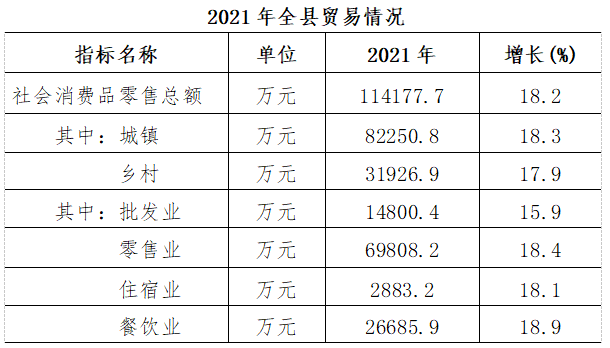 全县完成社会消费品零售总额114177.7万元,同比增长18.2%,其中,城镇完成消费品零售额82250.8万元,增长18.3%,乡村完成消费品零售额31926.9万元,增长17.9%。