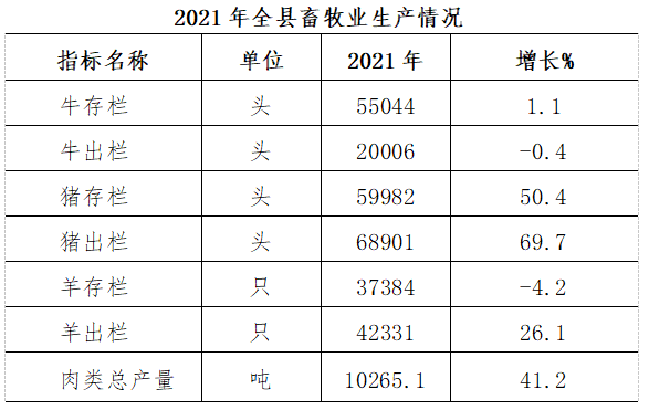 完成畜牧业总产值6.99亿元,同比增长21.1%。全年肉类总产量10265.1吨,增长41.2%。全年牛存栏55044头,出栏20006头;猪存栏59982头,出栏68901头;羊存栏37384只,出栏42331只。