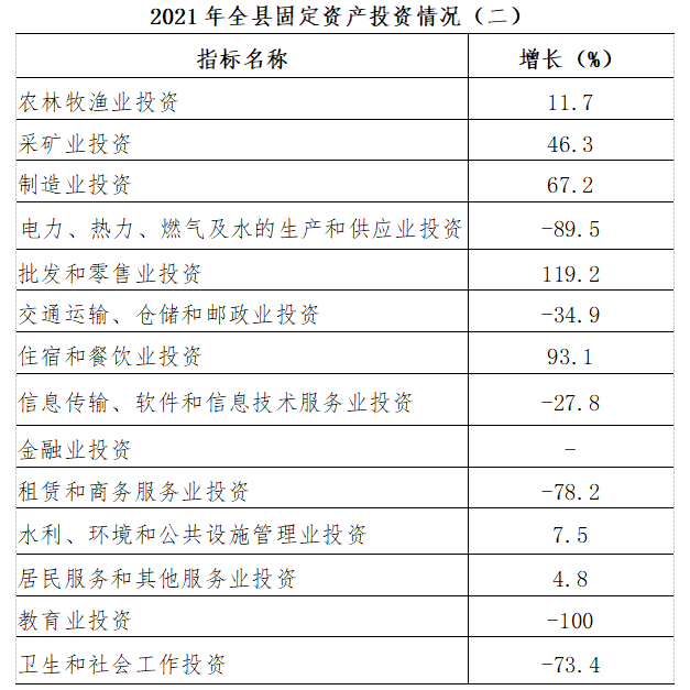完成农林牧渔业投资同比增长11.7%,占固定资产投资比重30.3%;采矿业投资增长46.3%,占固定资产投资比重32.3%;制造业投资增长67.2%,占固定资产投资比重5.0%;电力、热力、燃气及水的生产和供应业投资下降89.5%,占固定资产投资比重0.5%;批发和零售业投资增长119.2%,占固定资产投资比重1.4%;交通运输、仓储和邮政业投资下降34.9%,占固定资产投资比重2.9%;住宿和餐饮业投资增长93.1%,占固定资产投资比重1.1%;信息传输、软件和信息技术服务业投资下降27.8%,占固定资产投资比重0.2%;租赁和商务服务业投资下降78.2%,占固定资产投资比重0.4%;水利、环境和公共设施管理业投资增长7.5%,占固定资产投资比重18.7%;居民服务和其他服务业投资增长4.8%,占固定资产投资比重0.1%;卫生和社会工作投资下降73.4%,占固定资产投资比重0.1%。