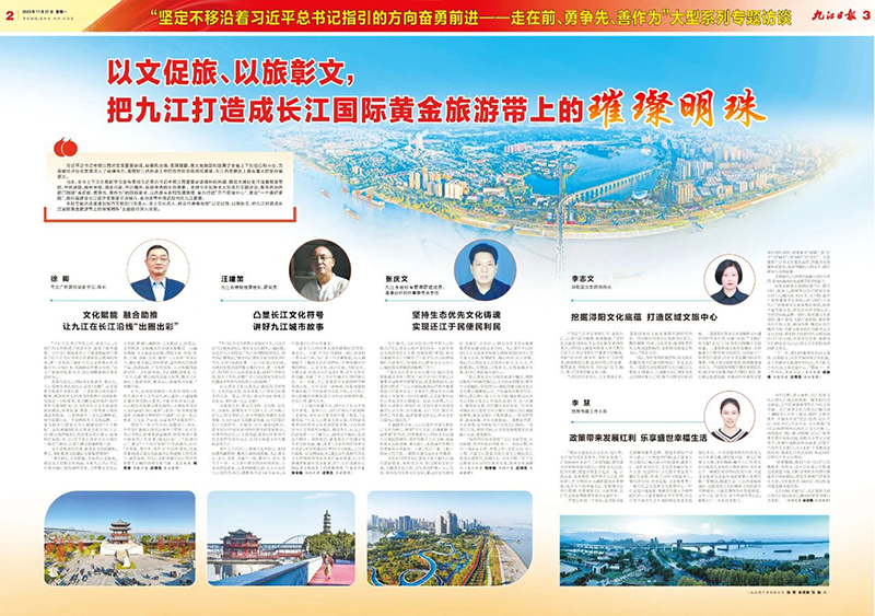 当前,九江上下正在掀起学习宣传贯彻习近平总书记考察江西重要讲话精神的热潮,赣北大地处处洋溢着解放思想、开拓进取,扬长补短、固本兴新,牢记嘱托、砥砺奋进的火热景象。九江市融媒体中心推出“坚定不移沿着习近平总书记指引的方向奋勇前进——走在前、勇争先、善作为”大型系列专题访谈。近日,该专题访谈特邀九江市文旅部门负责人、本土文化名人、群众代表等围绕“以文促旅、以旅彰文,把九江打造成长江国际黄金旅游带上的璀璨明珠”主题进行深入访谈。