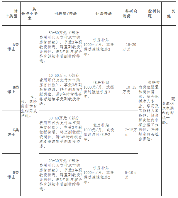 D类博士:达不到A类、B类、C类博士招聘条件,但又属教学科研单位急需的人员,年龄一般不超过38周岁,具有较大的发展潜质,已发表多篇高水平论文,试讲效果良好。