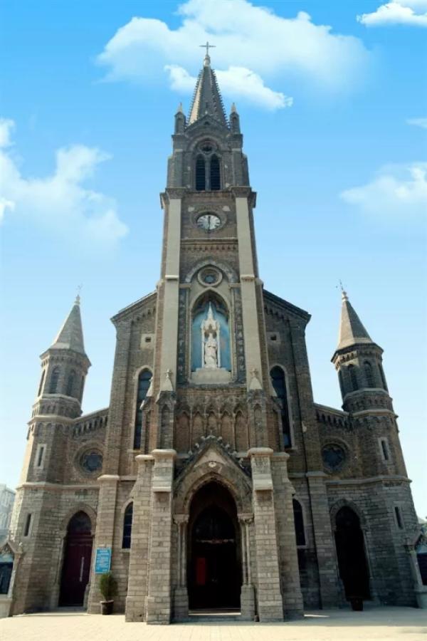 其有一座高四十二米的钟楼,顶端矗立着一个象征天主教教会的十字架,该教堂始建于1918年,1921年12月竣工,是华北现存最雄伟壮丽的圣堂。