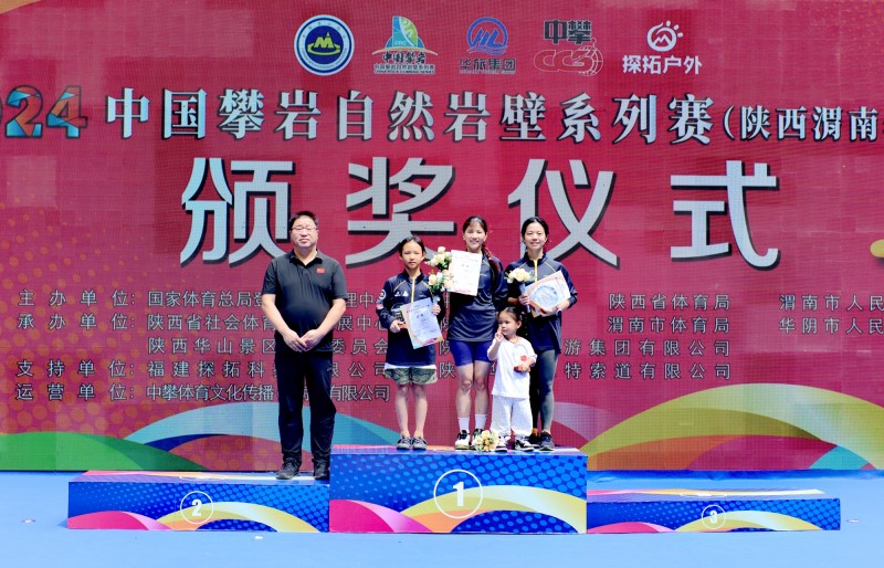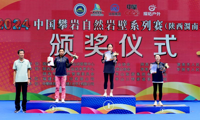 华山景区管理委员会党委委员副主任马耀峰为专业组女子难度速度赛前三名运动员颁奖