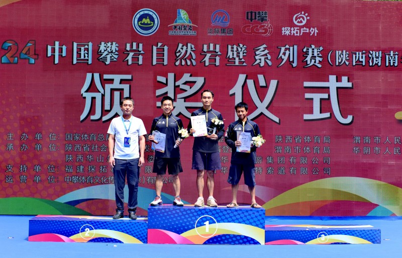 陕西华山旅游集团有限公司副总经理赵江峰为公开组男子难度速度赛前三名运动员颁奖