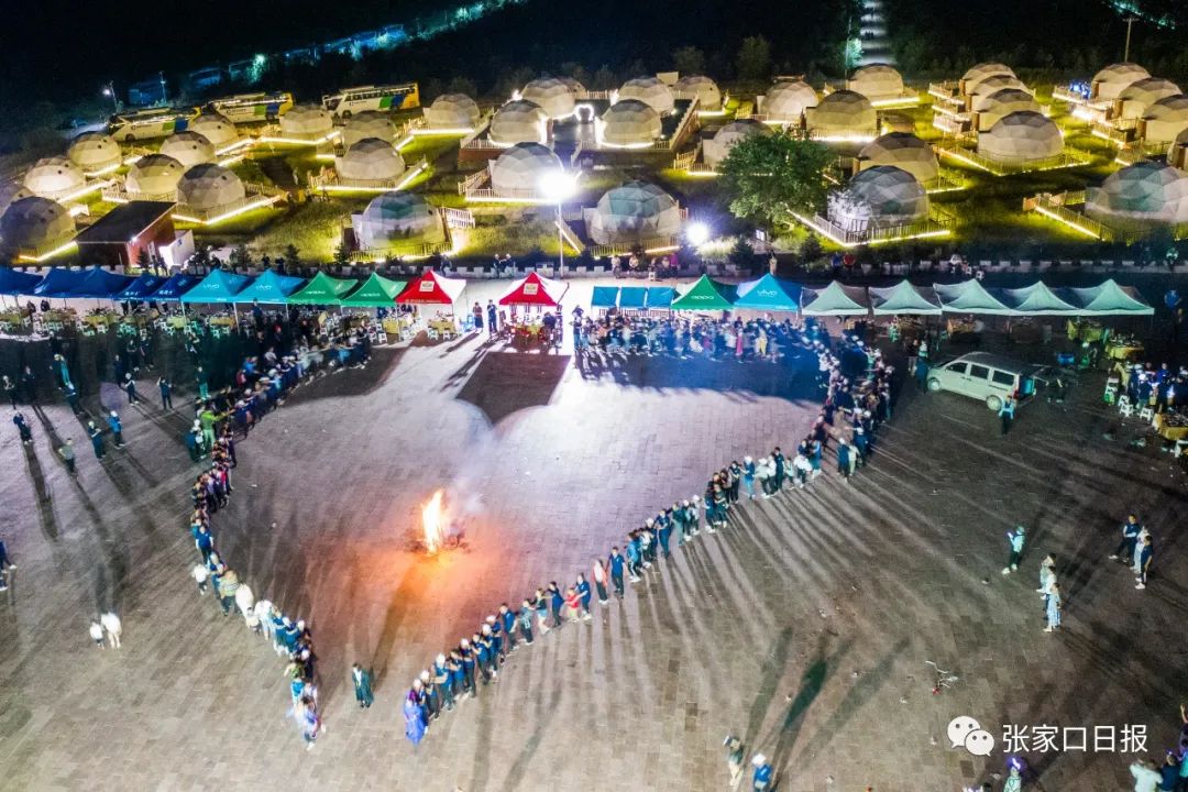 盛夏时节,我市坝上草原的醉人美景正吸引着众多游客前来避暑游玩,坝上草原旅游全面进入旺季。图为游客在察北管理区桃源山庄参加篝火晚会领略草原风情。 陈亮 辛海成 摄