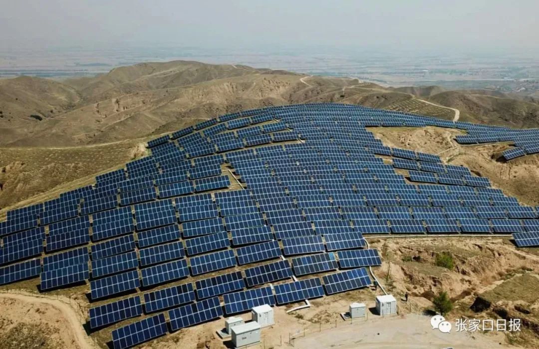 5月9日,电力工人在怀安县西沙城乡附近荒山上的光伏电站巡查。