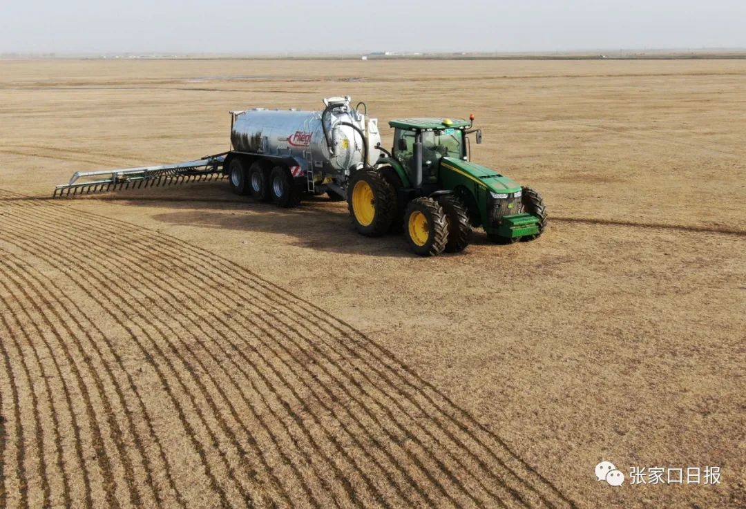 初春时节,工人操作着农垦进口专业大型农业机械设备,在塞北管理区黄土湾国家草原自然公园,对草场进行生态环境修复,把经处理的肥料均匀喷洒在草原上,为牧草生长提供养分。武殿森 王会文 杨卫红 摄