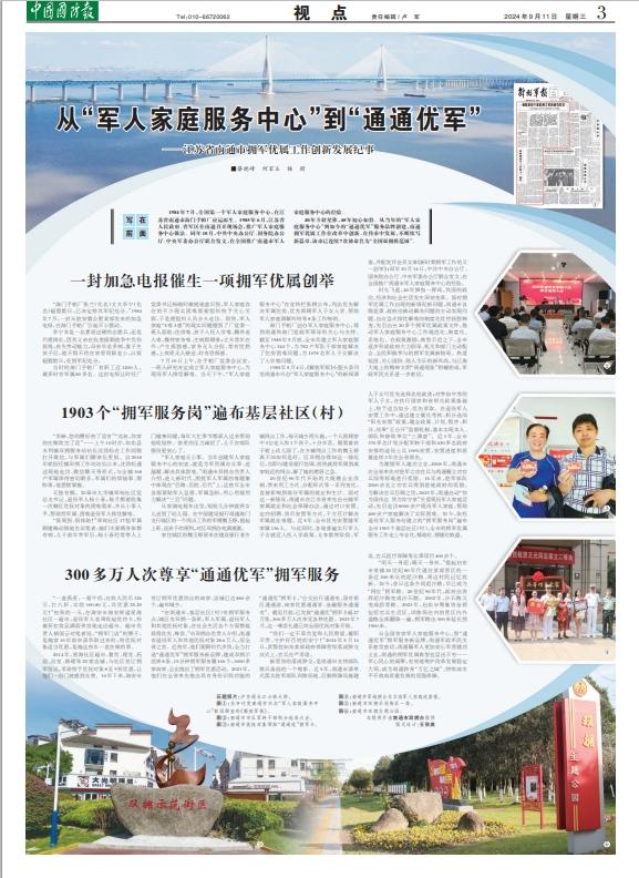 1985年5月4日,《解放军报》头版头条刊发南通市兴办“军人家庭服务中心”的新闻调查,并配发评论员文章《新时期拥军工作的又一创举》;同年10月14日,中共中央办公厅、国务院办公厅、中央军委办公厅联合发文,在全国推广南通市军人家庭服务中心的经验。