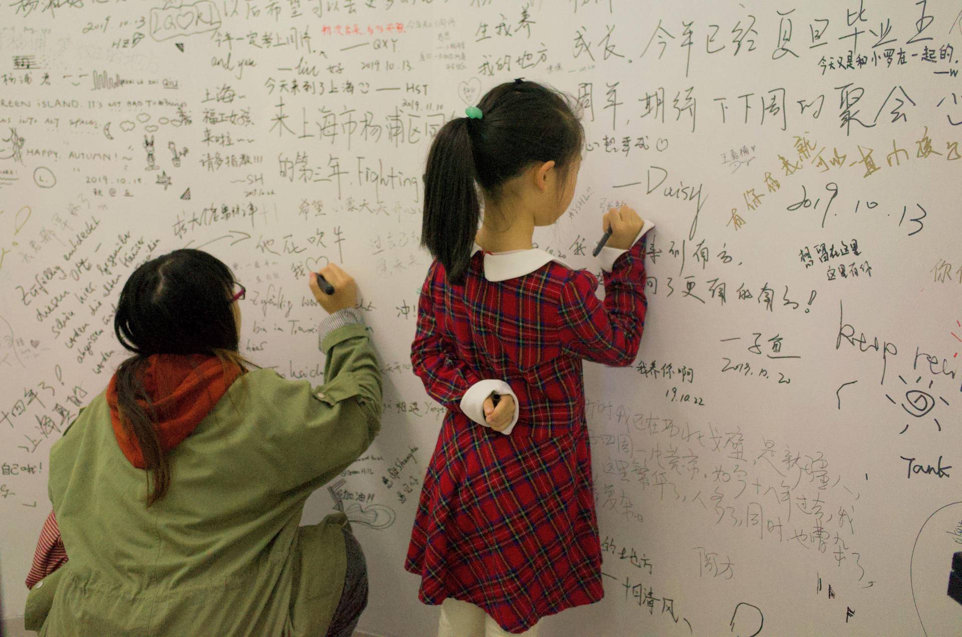 刚来上海半年的刘雨晗和殷若晨同为同济大学城市规划专业硕士新生。她对上海的认知也从杨浦开始。每次志愿者当班,她会坐公交到眉州路河间路下车,步行到达展馆。对她来说,这是一段挺奇幻的路程,从虹口杨浦交界的高等学府,到正在征收中的工人住宅区,最后到达改建一新的杨浦滨江。这段路程连同展览一道让她了解到杨浦的底色。和许多观众一样,她也喜欢的河流之梦的留言墙,在那里她为自己留言:希望我能找到一份好工作。