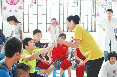 彩虹社工进入郑州市儿童福利院,跟脑瘫儿童做互动游戏。