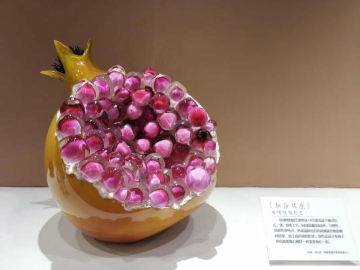 其次,行至各个展区,都能看到中华民族各地区文化交汇相融的作品,这些作品,既能很好的体现民族团结一家亲,同时也是文化润疆的良好见证。在北京展厅中,有依托和田玉设计制作的2008北京奥运会金镶玉奖牌和2022北京冬奥徽宝,还有为适应新疆气候而专门制作开发的一得阁墨汁;在河南展区,唐三彩《丝路长歌》也代表着两地历史与文化的交融,洛阳是丝绸之路的东方起点,而新疆是丝绸之路经济带核心区;山东展厅的《和合共生》,一颗颗玛瑙般晶莹璀璨的石榴籽紧紧抱在一起,象征着五十六个民族像石榴籽一样紧紧抱在一起,形象生动地诠释了民族团结一家亲的深刻寓意。