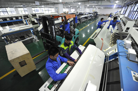 安徽合肥瑶海都市科技工业园内,工人对即将交付的新型色选机进行出厂检测-解琛-摄