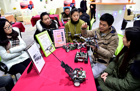 今年1月22日,合肥市常青街道创客梦空间内,青年创客向观众介绍飞行器及智能汽车作品-刘军喜摄