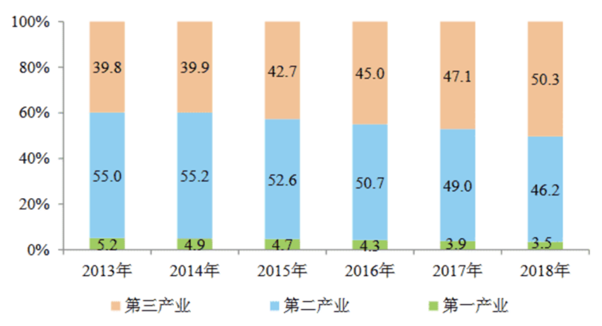 支撑合肥经济高速增长的是第三产业。数据显示,近五年合肥第三产业占比明显增涨,2013年的合肥还是第二产业占据主导,而到了2018年,三产比例首次超过了50%,这意味着合肥正向服务主导型经济转变。