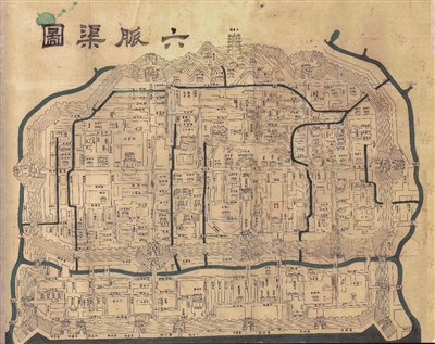 《六脉渠图》绘制于清代同治九年(1870年),广州从宋、明代开始兴修水利,挖掘六脉渠,六脉渠作为当时的排水大渠,按照当时城区地形修建,有“古渠有脉,渠道修于濠,濠通于海”之说,古渠兼有航行(木舟)之便利。除了兴建濠渠之外,还修筑城墙,逐步形成了“六脉皆通海,青山半入城”的城市雏形。地图清晰可见当年的城市水系框架。