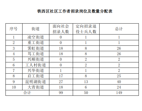 本次公开招录社区工作者149人,其中面向社会招录99人,定向招录退役士兵50人(某个街道定向招录人员不满,从全区退役士兵招录人员中按总成绩由高到低依次递补,未补足从本街道社会招录人员中按总成绩由高到低依次递补,仍未补足,从全区社会招录人员中按总成绩由高到低依次递补)。报考岗位以街道为单位。
