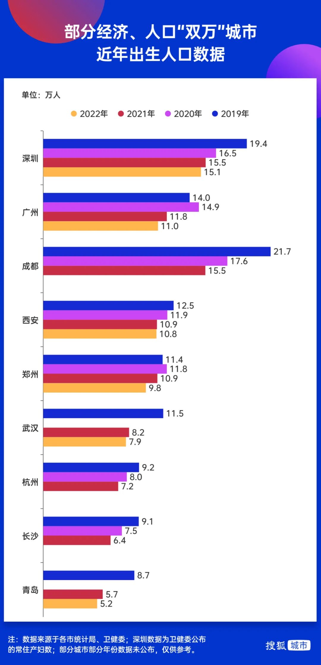 杭州和长沙的情况尚且如此,其余城市就更不必多说了。青岛2022年出生人口仅有5.2万,较2019年大幅减少41%。人口在900万量级的经济强市,如南京、宁波、济南等等,出生人口也都在5万上下徘徊,难以扛起生育大旗。