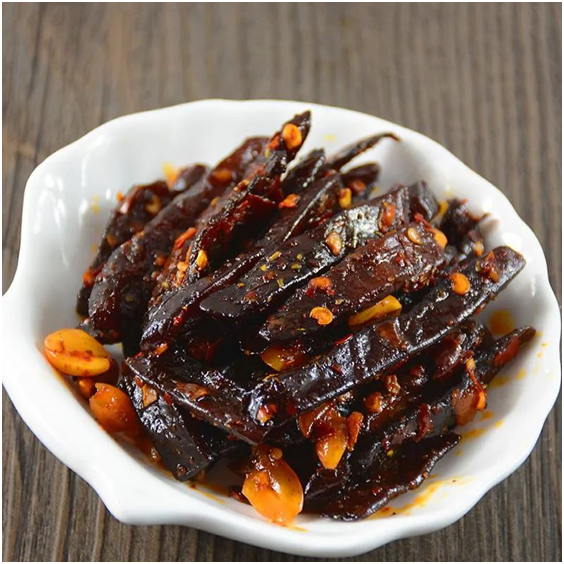 南溪豆腐干始于清光绪年间。用优质大豆水磨提取豆浆后煮浆、点浆、加压成型、添加酱油、八角、山奈、胡椒、丁香、白寇等三十余种配料卤制后排酸;烘烤、冷却后拌料调味;真空包装、高温、高压杀菌、化验。外包装后成品出厂。其质地密实、味道鲜美、营养丰富、咸淡适口、易于消化、老少皆宜。主要有五香味、麻辣味、鸡汁味等。2008年9月12日,原国家质量监督检验检疫总局批准对“南溪豆腐干”实施地理标志产品保护。