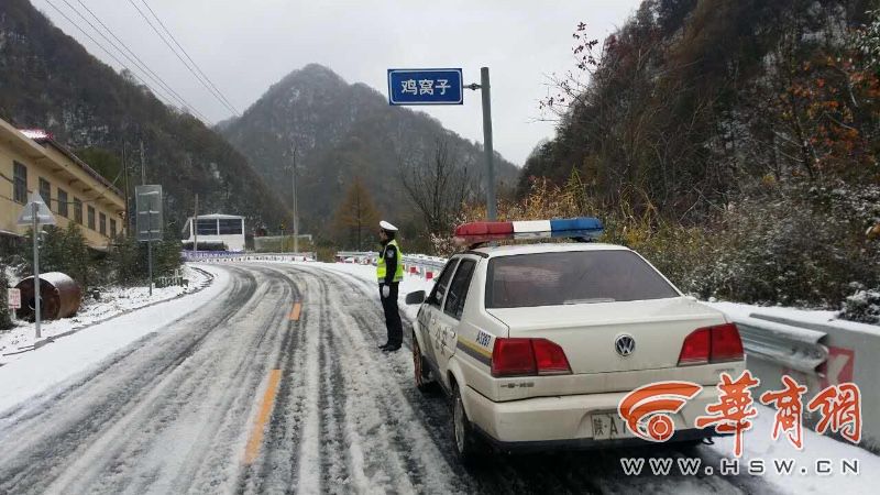 近日的连续降雨,导致秦岭山区气温骤降,从10月28日凌晨开始,210国道990公里-1003公里处(鸡窝子村至甘沟道班段)普降小雪,路面已形成一层积雪,道路湿滑。西安交警长安大队秦岭中队迅速启动恶劣天气情况下的应急预案,安排专门警力加强积雪路段的巡逻和对故障车辆的救助,并在沣峪口交通安全服务站对进山车辆加大宣传力度,提醒过往车辆携带防滑设施,谨慎驾驶;对进山的、无防滑设施的过境大客车和拉运危险化学品运输车辆坚决予以劝返。同时联系路政部门在积雪路段抛洒融雪剂,并启动联动机制,向宁陕交警广货街中队通报路面积雪情况,提醒过往驾驶人提前做好安全措施,并对无防滑实施的重点车辆实施临时交通管制。