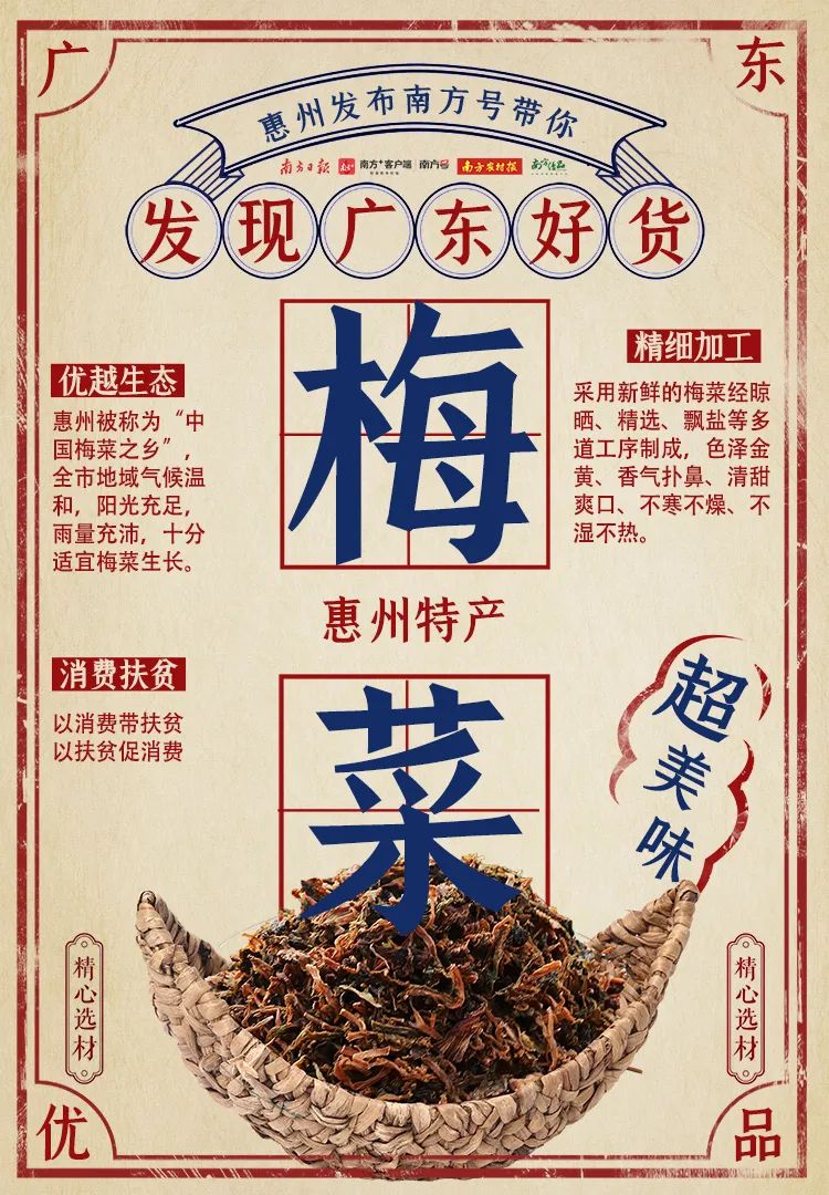 提起惠州地道农产品,梅菜可谓是最具代表性之一了。梅菜,是岭南著名传统特产,历史上作为宫廷食品而被称为“惠州贡菜”,有古诗描述称:“苎萝西子十里绿,惠州梅菜一枝花”,惠州被国务院授予“中国梅菜之乡”的称号。