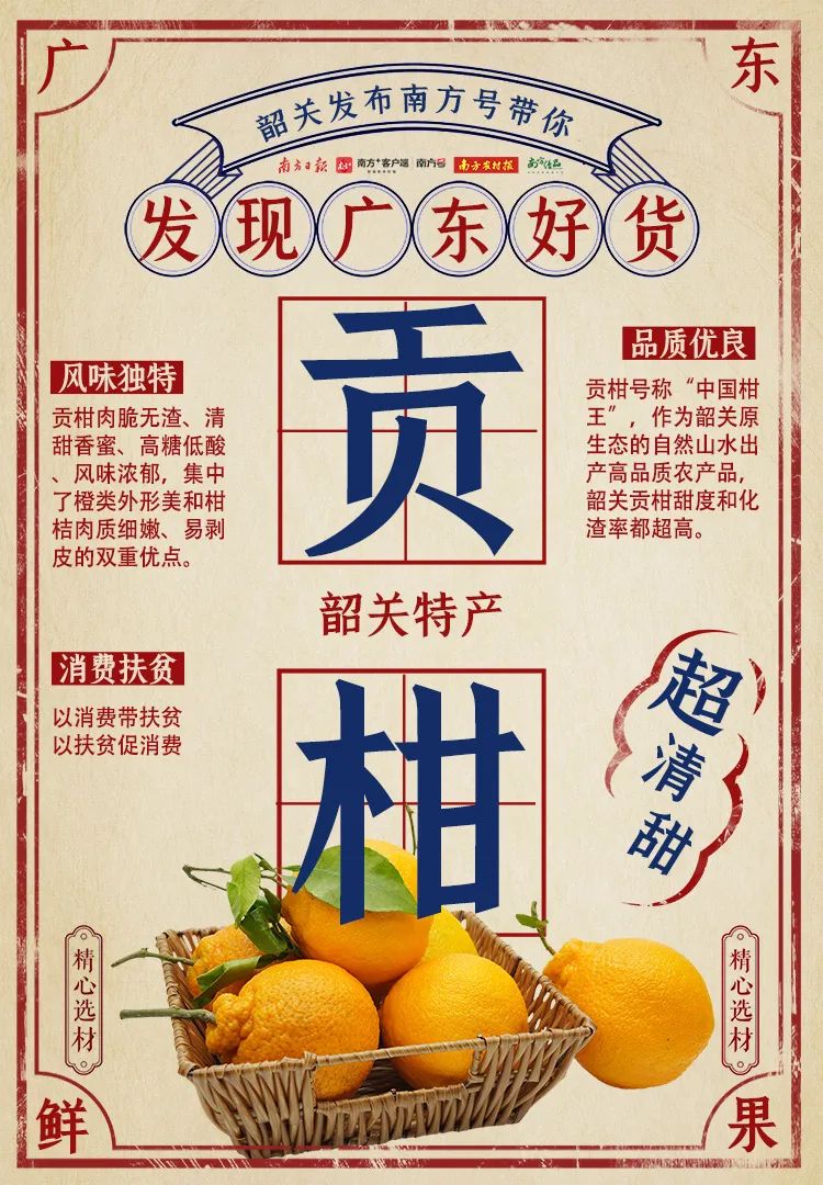 贡柑号称“中国柑王”,每年11月左右上市。果形靓丽、果色金黄、皮薄核少、肉脆无渣、清甜香蜜、高糖低酸、风味浓郁,它集中了橙类外形美和柑桔肉质细嫩、易剥皮的双重优点,为其他柑桔品种难以比拟,被誉为“柑桔之皇”。作为韶关原生态的自然山水出产高品质农产品,韶关贡柑甜度和化渣率都很高,核少而小且易剥皮。