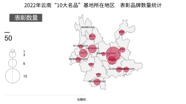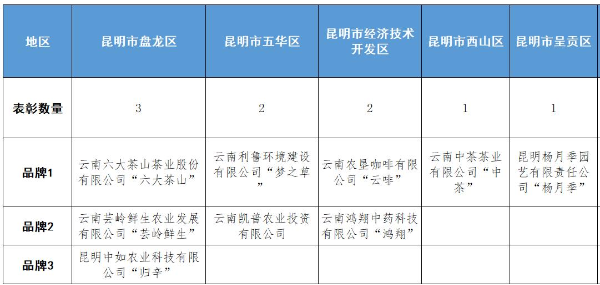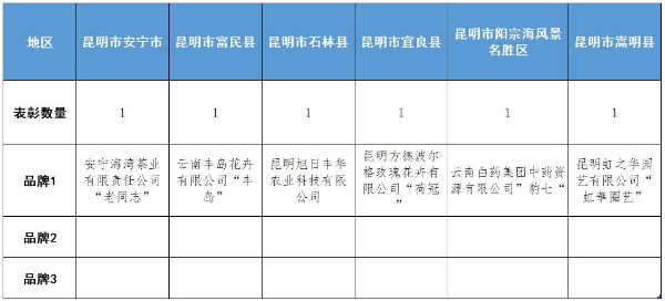 玉溪市、保山市、大理州各有5个品牌被评选上,丽江市和西双版纳州也各有3个上榜。文山、曲靖、昭通、红河、德宏各占两个表彰名额,临沧、楚雄、普洱、怒江各占1个。