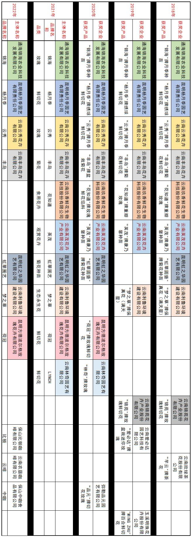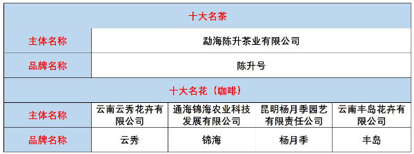 自2018年以来,云南省“10大名品”评选表彰活动已连续举办了5届。“十大名品”含“10大名茶”“10大名花”“10大名菜”“10大名果”“10大名药材”,每年合计上榜品牌50个。