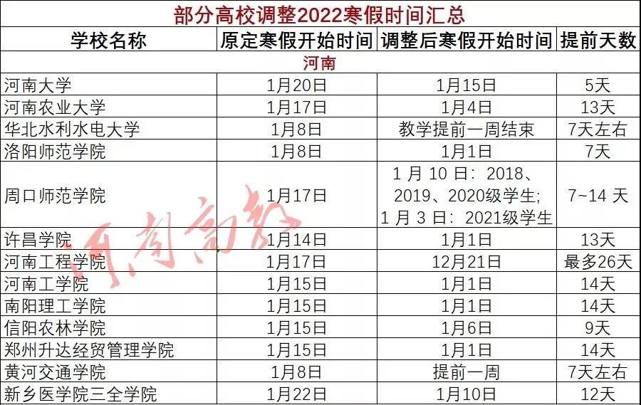 近期,根据各地学校情况和国内疫情形势,结合师生意愿和需求,河南多所高校通知调整寒假放假时间。如河南大学就将寒假开始时间从校历规划的2022年1月20日,提前至1月15日。