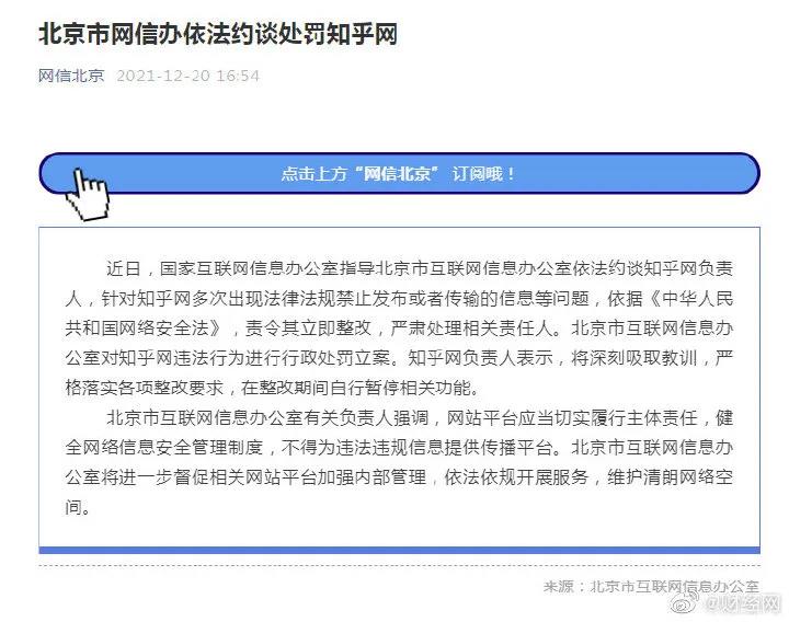 近日,国家互联网信息办公室指导北京市互联网信息办公室依法约谈知乎网负责人,针对知乎网多次出现法律法规禁止发布或者传输的信息等问题,依据《中华人民共和国网络安全法》,责令其立即整改,严肃处理相关责任人。北京市互联网信息办公室对知乎网违法行为进行行政处罚立案。知乎网负责人表示,将深刻吸取教训,严格落实各项整改要求,在整改期间自行暂停相关功能。