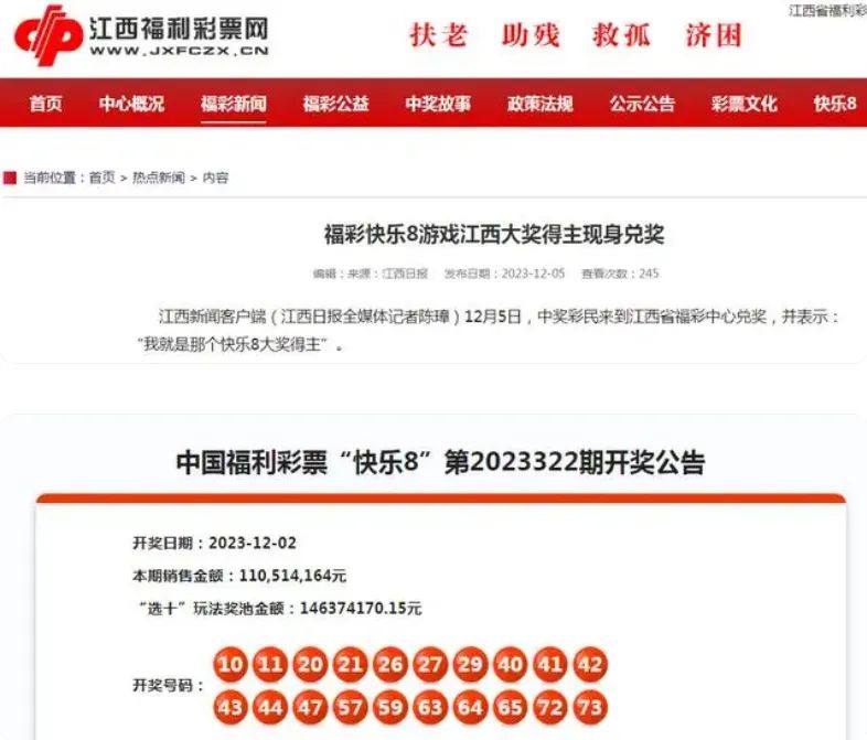 12月2日,江西南昌一彩民在福彩站点,共购买了近50000注号码相同的快乐8游戏“选七”玩法的彩票。当晚,他所购彩票均中得快乐8“选七中七”奖项,总奖金达2亿多元。据《江西日报》报道,12月5日,中奖彩民来到江西省福彩中心兑奖,并表示:“我就是那个快乐8大奖得主”。