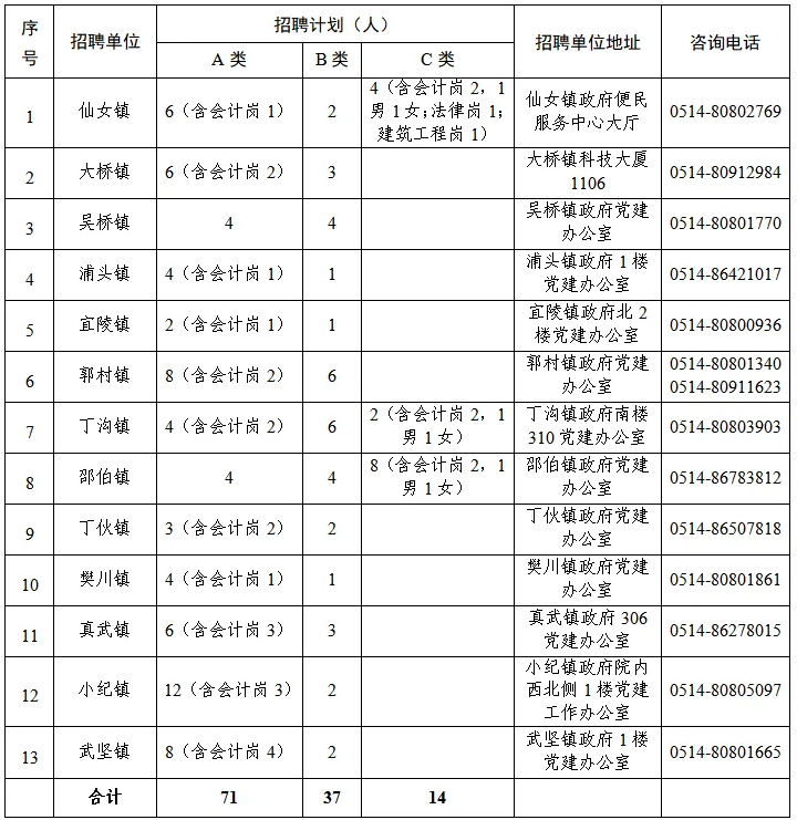 本次招聘A类岗男女比例原则上按2:1统筹(会计岗除外),C类岗除会计岗外限男性,仙女镇、丁沟镇、邵伯镇C类会计岗男女各1人。各镇(园区)具体岗位、名额分配详见附件。