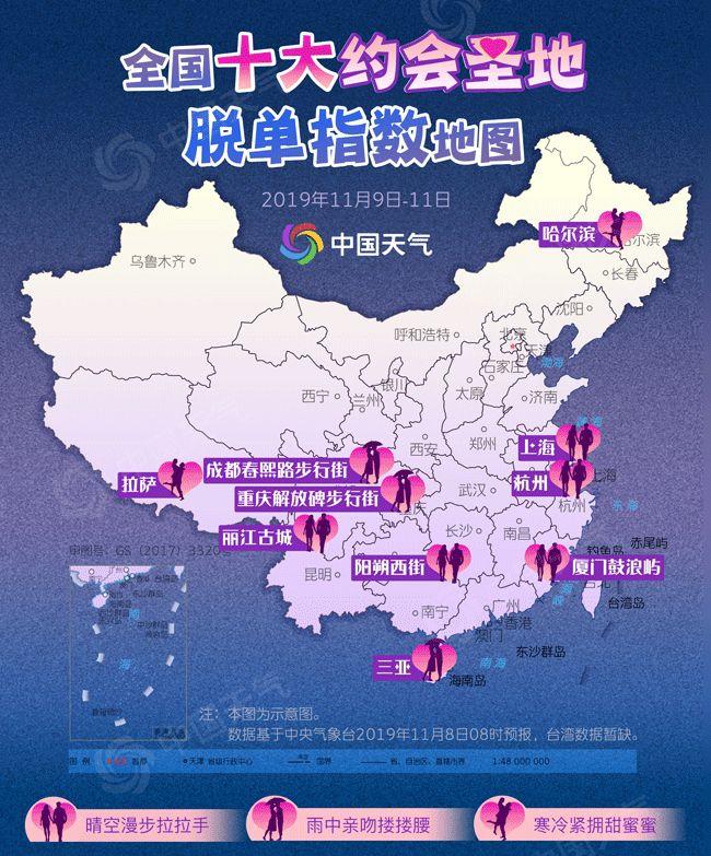 这个周末及双十一期间,北方虽然有点冷,但江南等地很暖和,最高气温在20℃左右。像是大城市中,丽江、上海、厦门、杭州等地阳光灿烂,蓝天指数高,气温舒适温暖,是约会及出游的好去处,脱单指数五颗星;阳朔、重庆、成都等地的天气也不错,偶尔阴天或小雨,不影响约会;而三亚这几天都有雨,哈尔滨有点寒冷,拉萨昼夜温差大,要想脱单得出绝招。