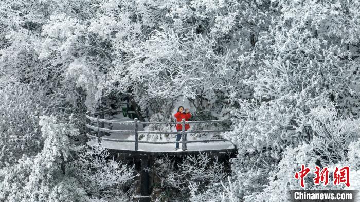 游客在安徽九华山的冰雪中拍照留念。(无人机照片)李晓白 摄