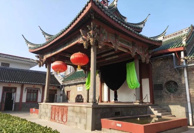 从南门进入会馆,最先看到的是戏台,四角重檐亭采用木质材料建成,檐枋之间用雕刻精致的花梁头连接。这座典型的古亭,相传原为福建所造,因从福建至烟台的海运途中构件沉没后在烟台补建。