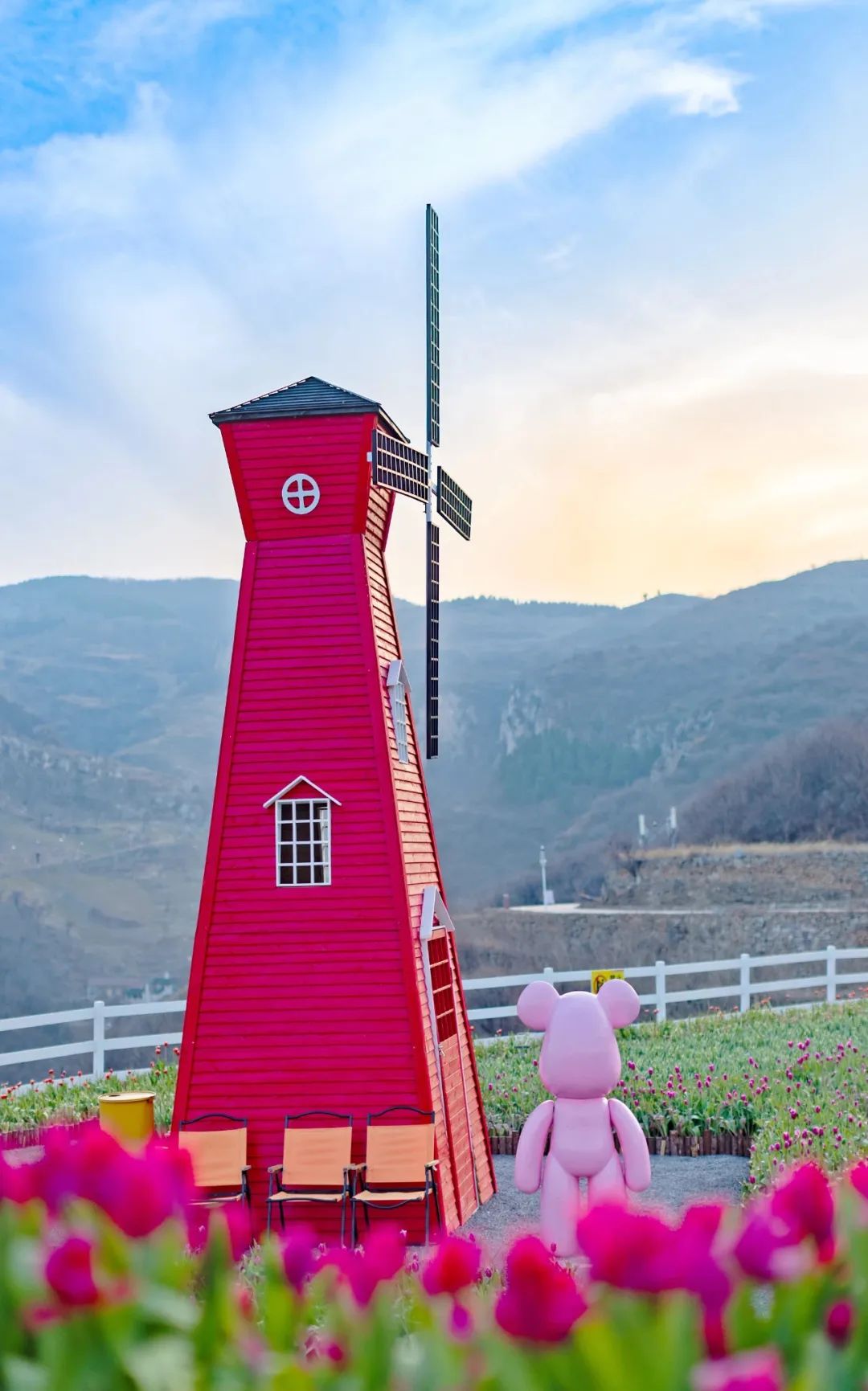 2024红叶柿岩第二届郁金香赏花节“云上的郁金香”「盛放期」来啦!不同的花朵相依偎,点缀出红、粉、紫、橙等十种色系,似是打翻的自然调色盘,将景区的美全力呈现。