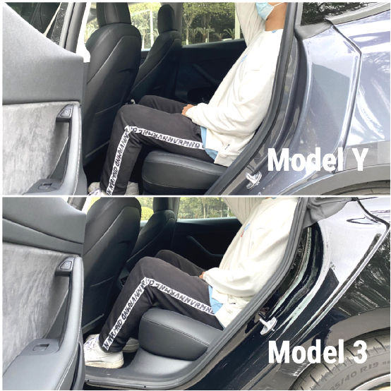 后排座椅感受可以说区别比较明显。从图片中我们可以看到,Model 3的座椅是更长的,承托性更好的同时柔软度的表现也更佳。Model Y的座椅要比Model 3的座椅更短,更硬,乘坐起来的对于大腿前部的支撑是不够的,虽然有着两级可调的靠背,但整体的坐姿还是比较的端正,包裹性也欠佳,没有Model 3可以稍微慵懒一些,坐的低矮一些,所以承托性和包裹性自然不如Model 3。