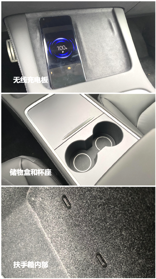 后方就是常规的杯架和扶手箱。T字区的储物格内部都有植绒,在车辆行驶晃动的时候也可以保护好储物格内的贵重产品,多了一层碰撞的缓冲。并配有两个Type-C的充电插口,可以使用有线充电。