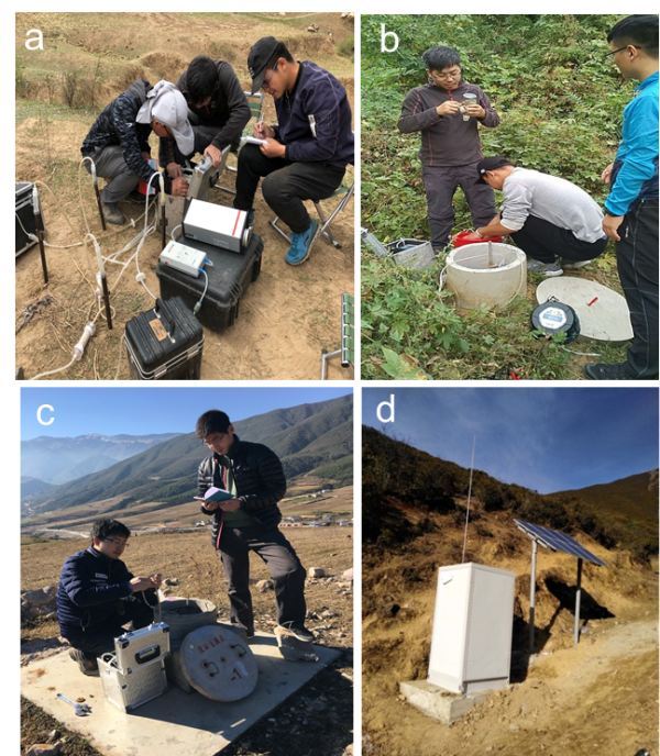 a:野外跨断裂流动观测;b:固定井流动采样;c:固定井流动观测;d:连续站在线实时观测